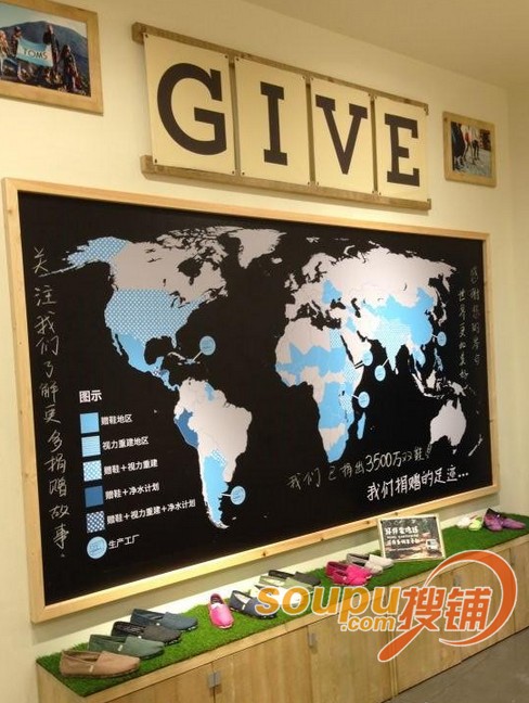 在TOMS深圳KKMall店内,入门便可见“我们努力为需要帮助的人们改善生活”这句话的中英双语的标语,美丽的鲜花、周到的服务、各种最新的男女士鞋款、还有暖人心的捐赠故事,无处不在。
