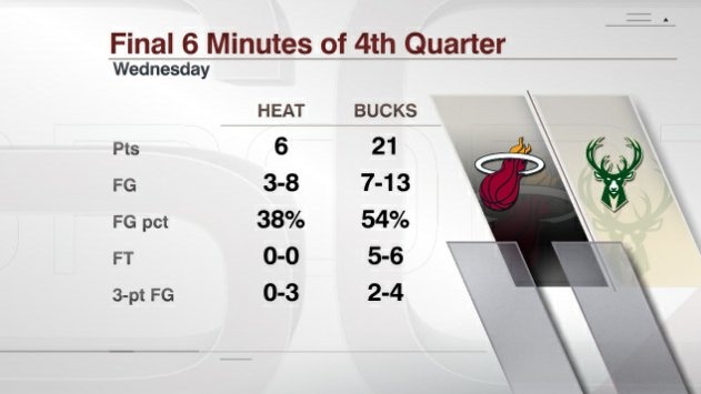 在最后6分钟里,雄鹿打出21-6的攻击波成功翻盘。在这期间,雄鹿13投7中(命中率54%),罚球6中5,三分4中2;热火8投3中(命中率38%),三分3中0。