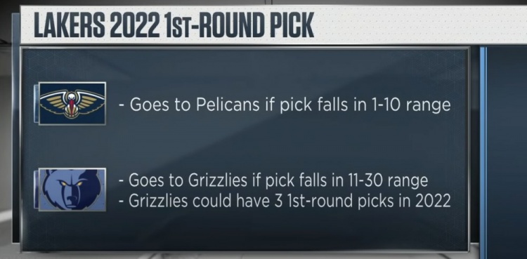 湖人2022年的首轮签先是在戴维斯的交易中被送到鹈鹕,又被鹈鹕在瓦兰与亚当斯的交易中送到灰熊。