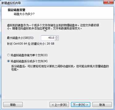 进入以下这个页面,磁盘空间我们选择40G,这个磁盘是占用你的物理磁盘,下面选择第二个选项“将虚拟磁盘拆分多个文件,这样性能快一些”,点击下一步,