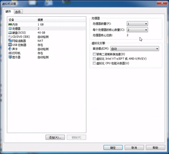 就新建完成了,我们就可以看到这个页面,这些参数都是我们虚拟硬件设备的参数,它占用你台式机的资源,点击处理器,可以给多两个吗?可以的,点击进去,