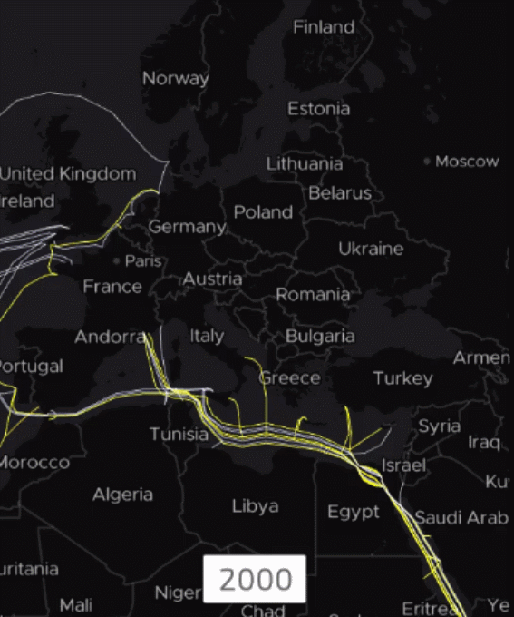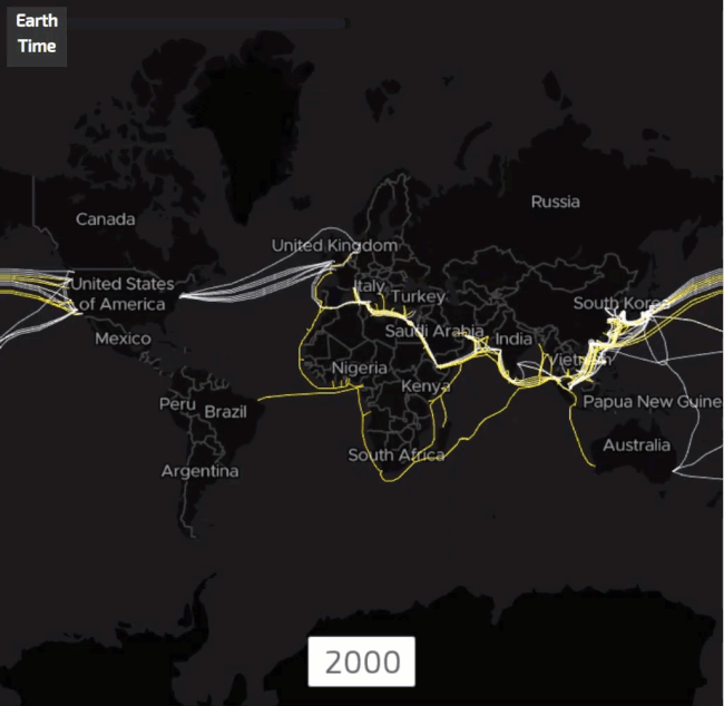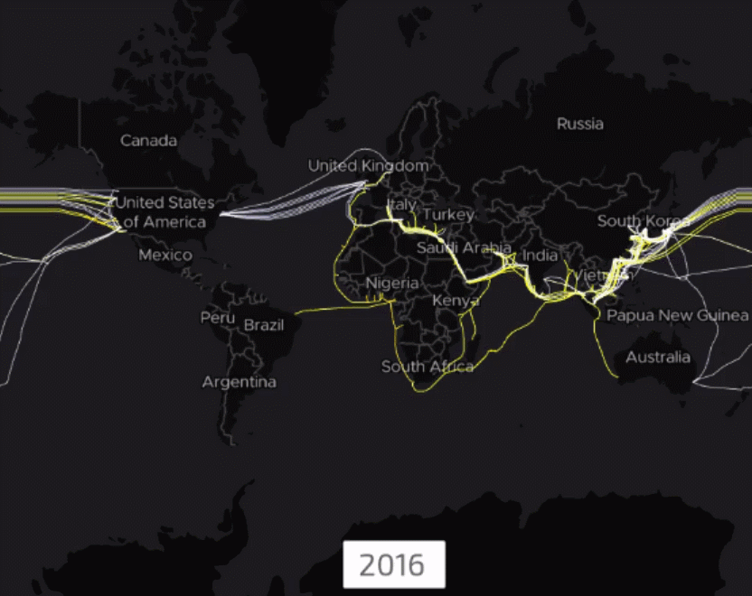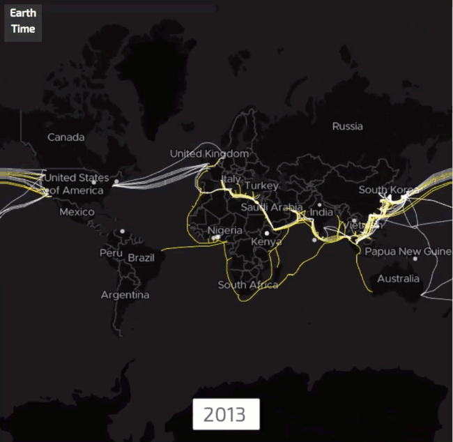 2000年,一条光纤海底电缆建成,它连接东南亚、中东、西欧,电缆取名叫作“SEA-ME-WE3”,全球39000公里,由一个财团负责,而中国电信正是财团的领导者。自此之后,中国企业积极参与全球海底电缆建设,总长度超过530000公里。顺便说一句,地球的周长是40万公里。