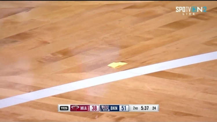 比赛第二节,篮网的天花板上不断地掉下零散的彩带,工作人员只能上场将它们捡走。