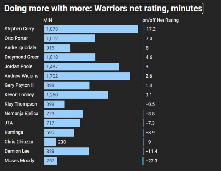 其中,库里出场时间全队第一,on/off净效率值17.2一枝独秀高居第一;