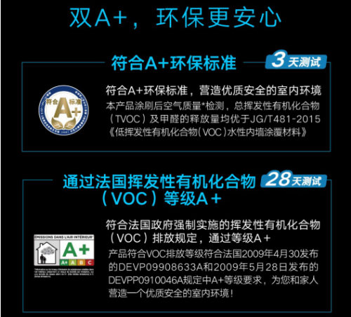 一直以来,立邦将创新和环保有机结合,致力于打造放心、安全的家居环境。立邦投影漆采用特有漆膜技术和环保配方,涂刷后空气质量检测,总挥发性有机化合物(TVOC)及甲醇的释放量均优于JG/T481-2015《低挥发性有机化合物(VOC)水性内墙涂覆材料》A+标准。同时,产品VOC排放符合法国2009年4月30日发布的DEVP0910046A规定中A+等级要求。双A+的环保守护,专业的检测,为消费者营造一个优质安全的室内观影环境。