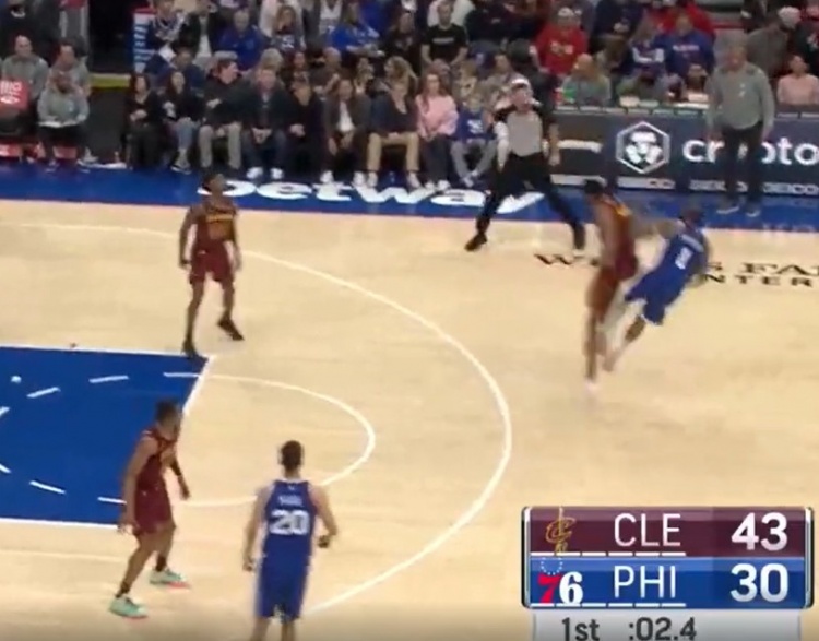比赛第一节最后时刻,哈登后撤步跳投,但是他的脚向前踢到了防守的莫布里,裁判根据吹罚了哈登进攻犯规!
