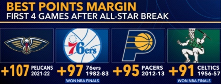至此,鹈鹕在全明星周末后的前四场比赛中取得4连胜,且总共净胜对手107分,为NBA历史上第一支在全明星后的前四场比赛中净胜对手100+的球队,同时是第四支在全明星后的前四场比赛中净胜对手90+的球队。