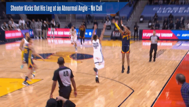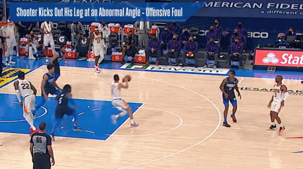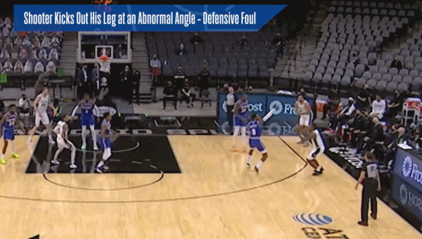 3、进攻球员以异常角度向上或者向侧踢腿(The shooter kicks his leg (up or to the side) at an abnormal angle);