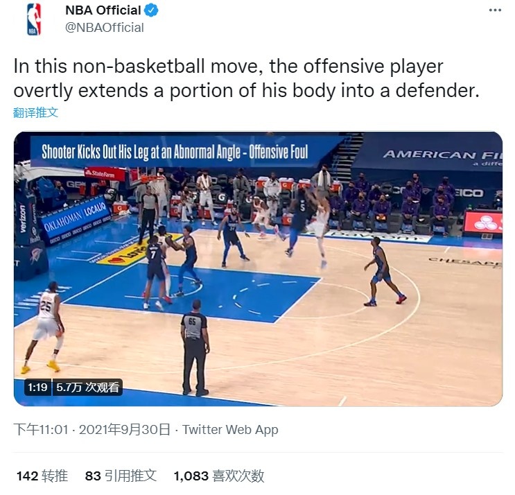 上半场被吹进攻犯规这一次,裁判认为哈登向上踢腿的幅度已经属于异常(abnormal),并且因此绊倒了莫布里,所以吹了哈登进攻犯规(保命备注⚠️:表哥只是解释判罚依据,至于裁判这次判得正确不正确,表哥不表态);