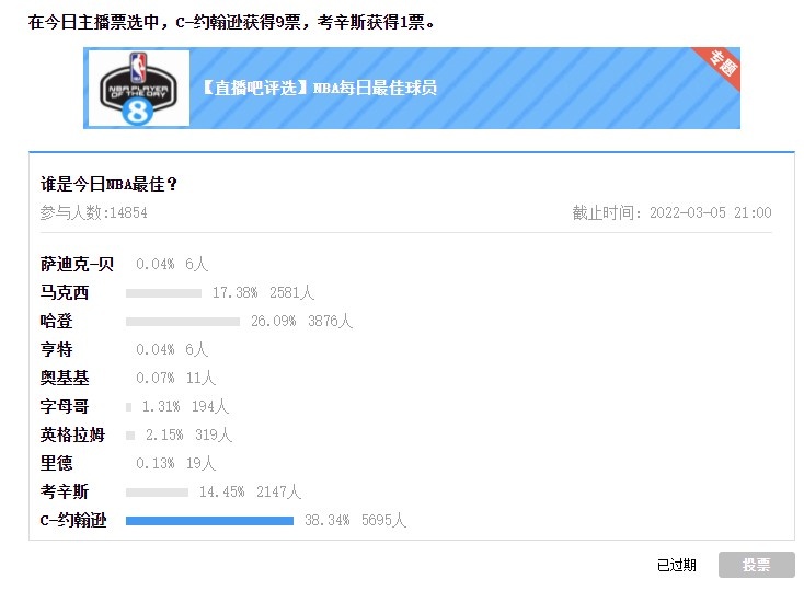 在今日主播票选中,C-约翰逊获得9票,考辛斯获得1票。