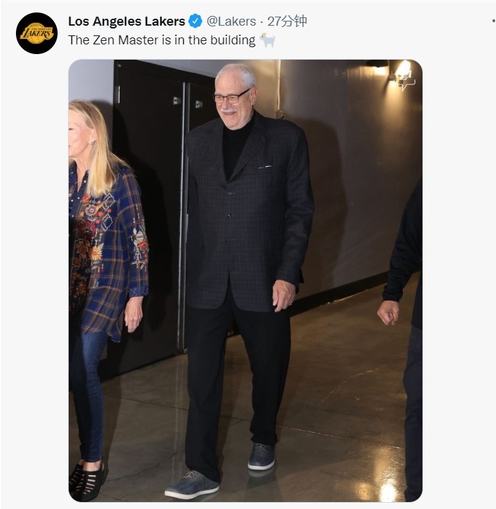 湖人官方晒出前湖人传奇教头菲尔-杰克逊赛前入场观赛照片,配文写道:“禅师来啦