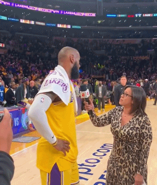 赛后,女记者突然的后撤步,詹姆斯被杀出的斯坦利-约翰逊浇了一头水。