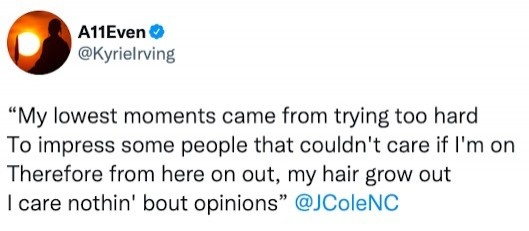 赛后篮网球星欧文更新推特,他写道:“我最低谷的时刻是,太过于想去给一些不在乎我是否处在最佳状态的人留下好的印象。所以从现在起,我不再介意了,我不在乎别人的看法。@JColeNC”