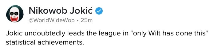 美国著名媒体人Rob Perez 赛后发推说道:“毫无疑问,约基奇在拿到‘仅张伯伦做到过’数据的次数上遥遥领先联盟。”值得一提的是,Rob Perez(推特账号@WorldWideWob)已经将自己的推特昵称改成了尼古沃伯-约基奇(Nikowob Jokić)注:约基奇全名“尼古拉-约基奇”(Nikola Jokić)。同时他将自己的推特头像也换成了小丑主题,而约基奇在联盟的外号正是Joker(小丑)。