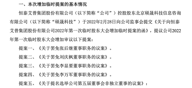 在此之前,恒泰艾普股东硕晟科技曾向董事会提案召开临时股东大会审议《关于罢免孙玉芹董事职务的议案》,此后又在3月1日增加临时提案要求罢免张后继、刘庆枫、李显要和李万军等人的董事职务,同时提名推举另外5人补位非独立董事。![]()