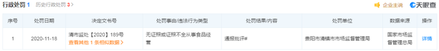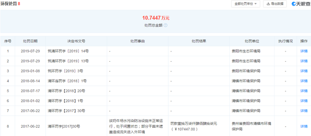 据天眼查数据显示,贵阳中博成立于2016年5月10日。在2017年至2019年期间,贵阳中博因环境污染问题被生态环境部门做出8次环保处罚;2020年11月18日,贵阳中博又因无证照或证照不全从事食品经营被贵阳市清镇市市场监督管理局通报批评。