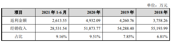 在对经销商的高度依赖下,阳光乳业的利润空间也进一步被压缩。记者发现,为了促进经销商销售,公司会给予经销商一定的返利和补贴。2018年至2020年以及2021年1-6月,公司给予经销商的返利金额分别为3758.26万元、4260.76万元、4932.09万元和2613.55万元,分别占经销收入的6.81%、7.85%、9.51%和9.16%。
