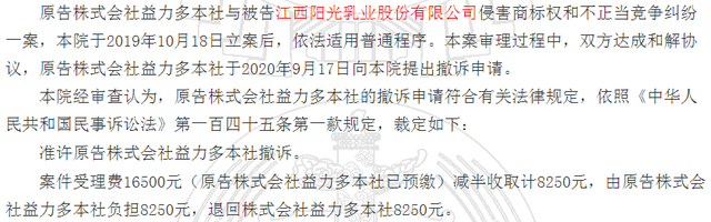 据中国裁判文书网(2019)赣01民初722号一审民事裁定书显示,阳光乳业因侵害商标权和不正当竞争纠纷一案被株式会社益力多本社告上法庭。后阳光乳业不服江西省南昌市中级人民法院(2019)赣01民初722号民事裁定,向江西省高级法院提起上诉,被驳回维持原判。在后续审理过程中,双方达成和解协议,原告株式会社益力多本社于2020年9月17日提出撤诉。