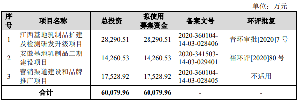 根据招股书显示,阳光乳业此次IPO拟募集资金约6.01亿万元用于江西基地乳制品扩建及检测研发升级项目(以下简称“项目一”)、安徽基地乳制品二期建设项目(以下简称“项目二”)、营销渠道建设和品牌推广项目的投资建设。其中,项目一和项目二拟投入募集资金合计约4.26亿元,占拟募集资金的70.88%;两个项目建成后,年产奶制品将合计增加11万吨,为2020年总产能的近1.5倍。