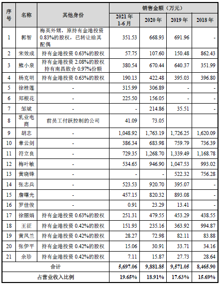 此外,记者还发现公司的多个主要经销商为公司前员工或公司参股股东之一的情况。据招股书披露,像这样拥有“多重身份”的经销商达到21个。
