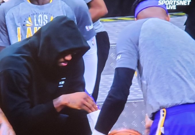 坐在场边的詹姆斯带着连帽衫吃起了爆米花,从他抖动袋子的动作来看,已经吃得只剩底了。