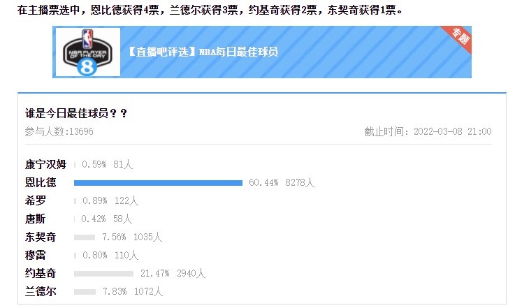 最佳球员评选规则:候选球员由各场主播提名,主播投票占比30%,吧友投票占比70%,总计占比最高者为当日最佳球员,最终恩比德当选。