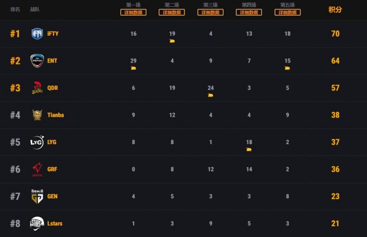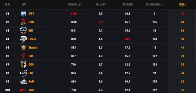 战队榜上,iFTY拿到70个淘汰排名第一,QDR与ENT分别有64与56个淘汰排名二三位。
