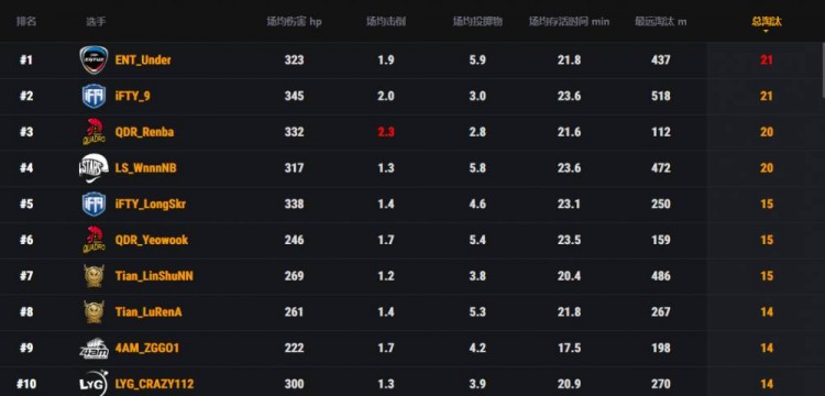 个人榜上,ENT战队Under与iFTY的9选手都有21个淘汰排名前二。