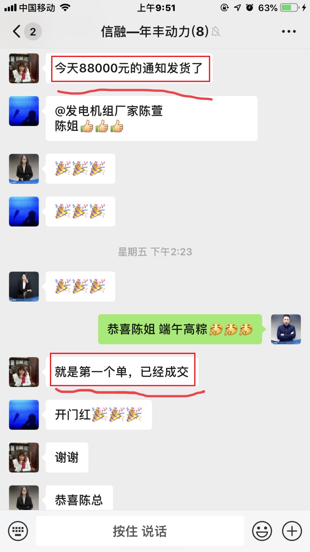 ,突如其来一条银行转款信息“【中国农业银行】尊敬的客户......于06月06日17:34向贵公司的农业人银行账户完成转入交易,金额为44000”。成交啦!!!端午佳节之际,陈总第一时间将成交的喜悦与我们分享,精准商机离不开我们上下一心积极从线上获取,陈姐也将发电机西北龙头企业的实力展露无疑,