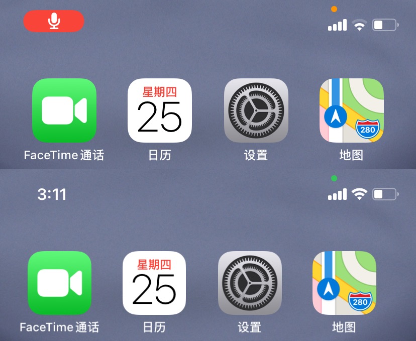 iOS 14的另一个好更新是隐私功能,苹果对App的后台加强了限制,如果App在后台偷拍的话,屏幕顶部就会出现绿点,录音则出现橙点。
