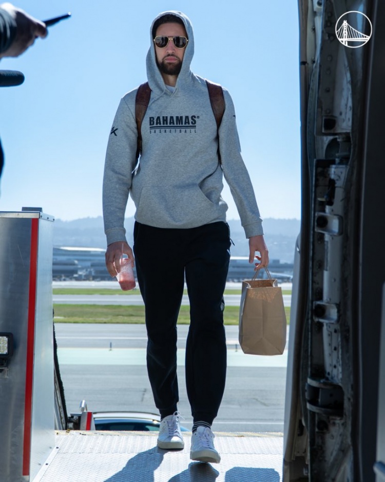 照片中克莱一脸严肃。库里则依旧是大包小包。