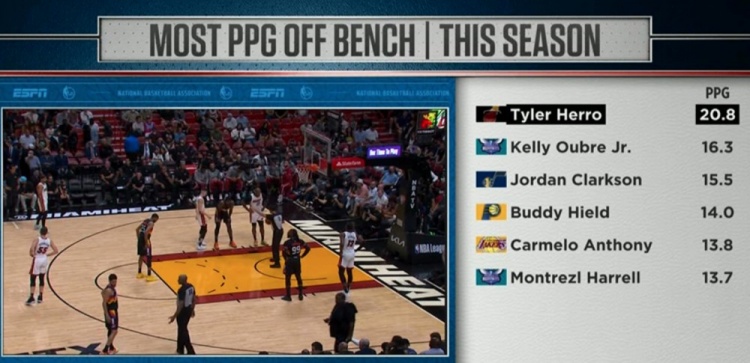 赛中,转播商晒出了一组本赛季替补球员场均得分前六的排行榜,具体如下: