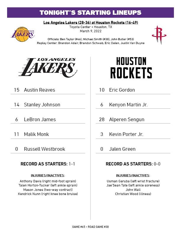 湖人:奥斯汀-里夫斯、斯坦利-约翰逊、詹姆斯、蒙克、威少(这套首发本赛季第3次使用,前2次1胜1负);