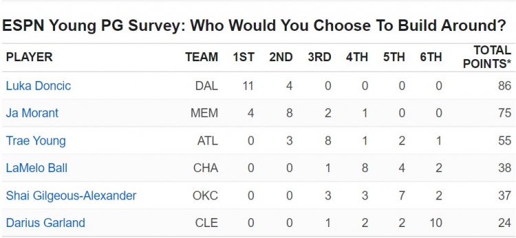 3月10日讯近日,ESPN对15个联盟球探和高管进行了匿名调查,让他们比较了6个仍处在新秀合同中得全明星控卫:东契奇、莫兰特、三球、亚历山大、特雷-杨、加兰德。