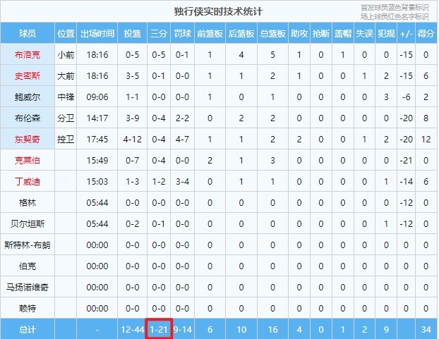 截至半场,独行侠队三分球21投仅1中(前19投全丢),仅丁威迪在第二节末段命中一记三分,以34-61暂时落后尼克斯。