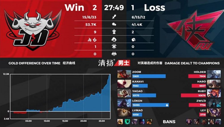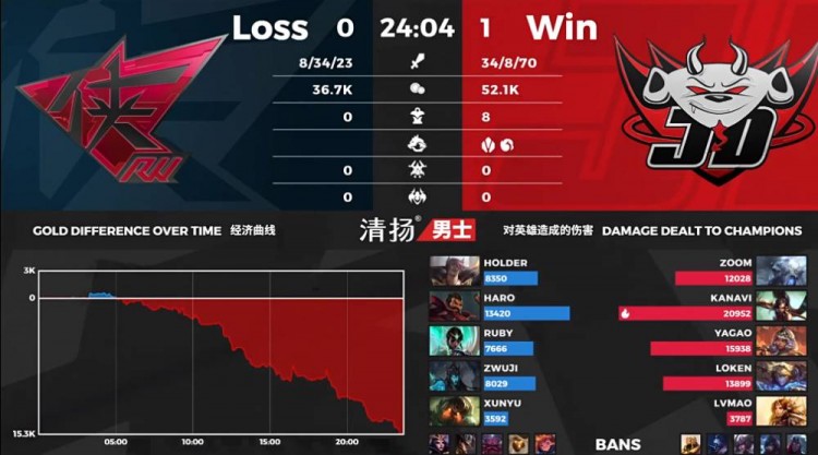 【27:00】中路狗熊和腕豪想要强开,但是巴德断了RW后排,JDG反打将RW四人击杀后,下路直接一波结束了比赛。