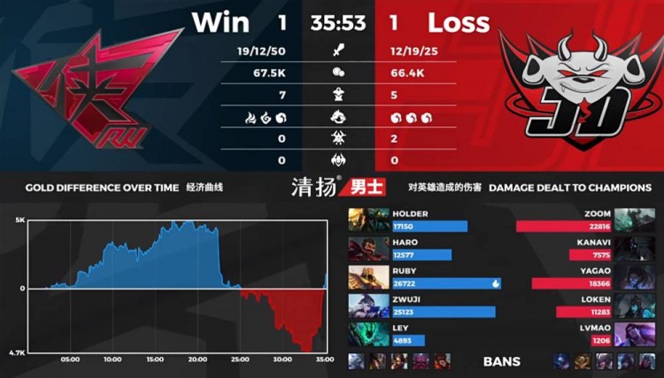 【21:35】RW在上半野区蹲人,女坦发现后石像鬼主动开团,JDG一换五团灭了RW后破掉中路高地;