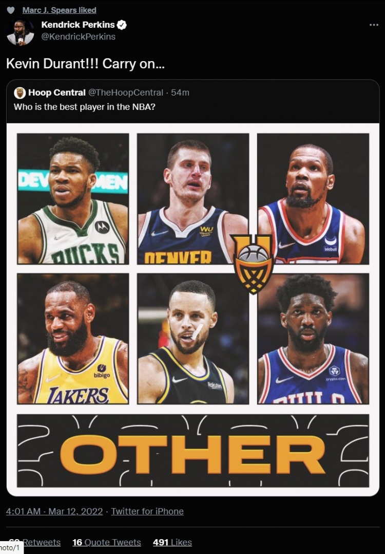 帕金斯则转发了这条推特,并写道:凯文-杜兰特!!!