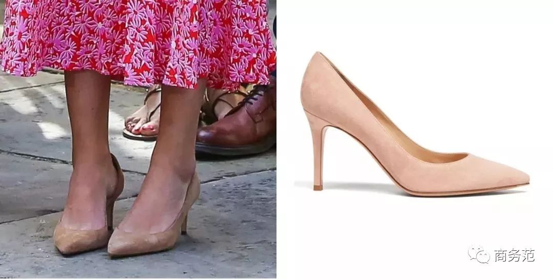 她搭配了一双裸色麂皮高跟鞋,来自Gianvito Rossi,感觉莫名眼熟…没错,就是凯特王妃常穿的鞋履品牌,款式和颜色也是凯特最爱。