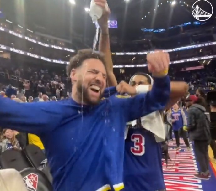 勇士官推晒出此段视频,并配文道:“这一点点水可没法让克莱冷却哟!”