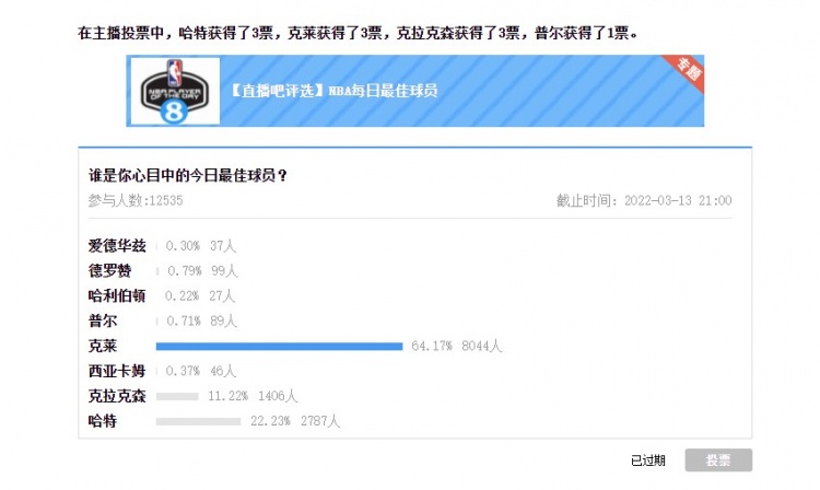 在主播投票中,哈特获得了3票,克莱获得了3票,克拉克森获得了3票,普尔获得了1票。