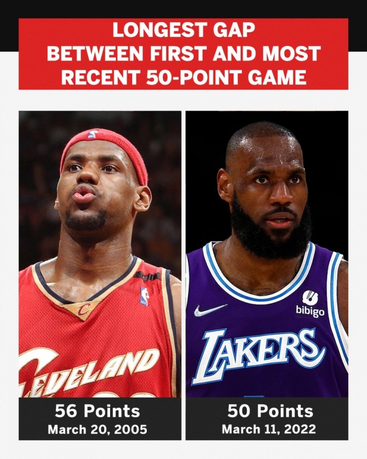 詹姆斯生涯第一次50+是在2005年3月20日,和这次相隔刚好17年,据美媒统计,这是历史上最长的间隔。
