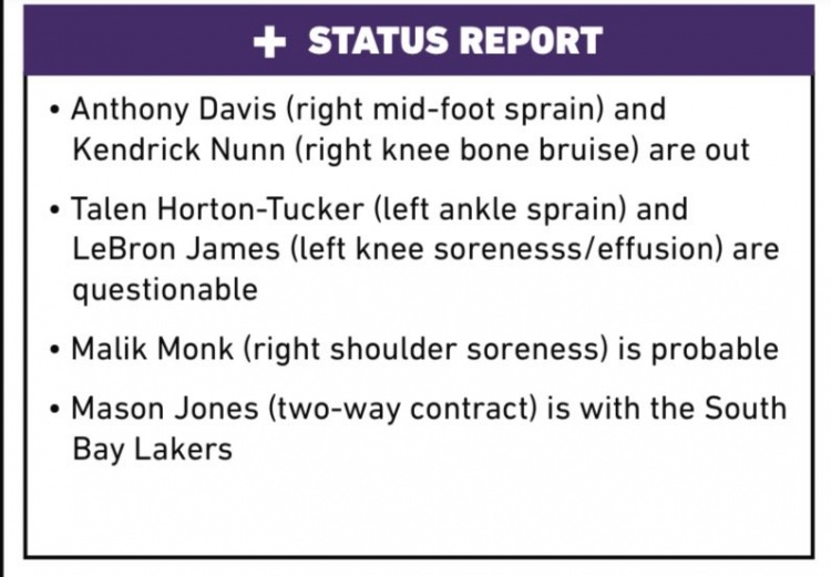 蒙克(右肩酸痛)大概率出战;梅森-琼斯(双向合同)在发展联盟南湾湖人队打球。