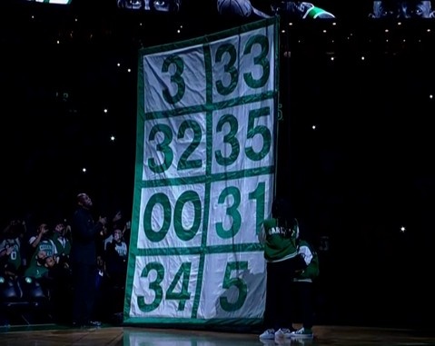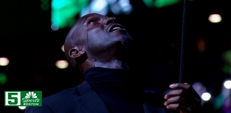 加内特的5号球衣与00号罗伯特-帕里什、3号丹尼斯-约翰逊、31号塞德里克-麦克斯维尔、32号凯文-麦克海尔、33号拉里-伯德、34号保罗-皮尔斯、35号雷吉-刘易斯在同一面旗帜上。