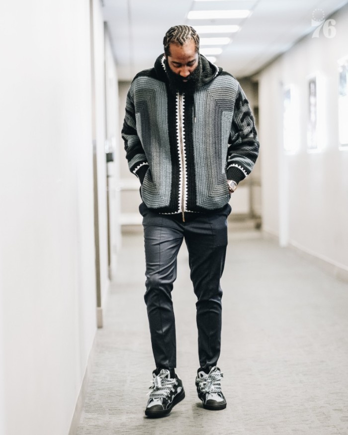 詹姆斯-哈登今日入场,表情有些严肃,小乔丹花裤子有些显眼。