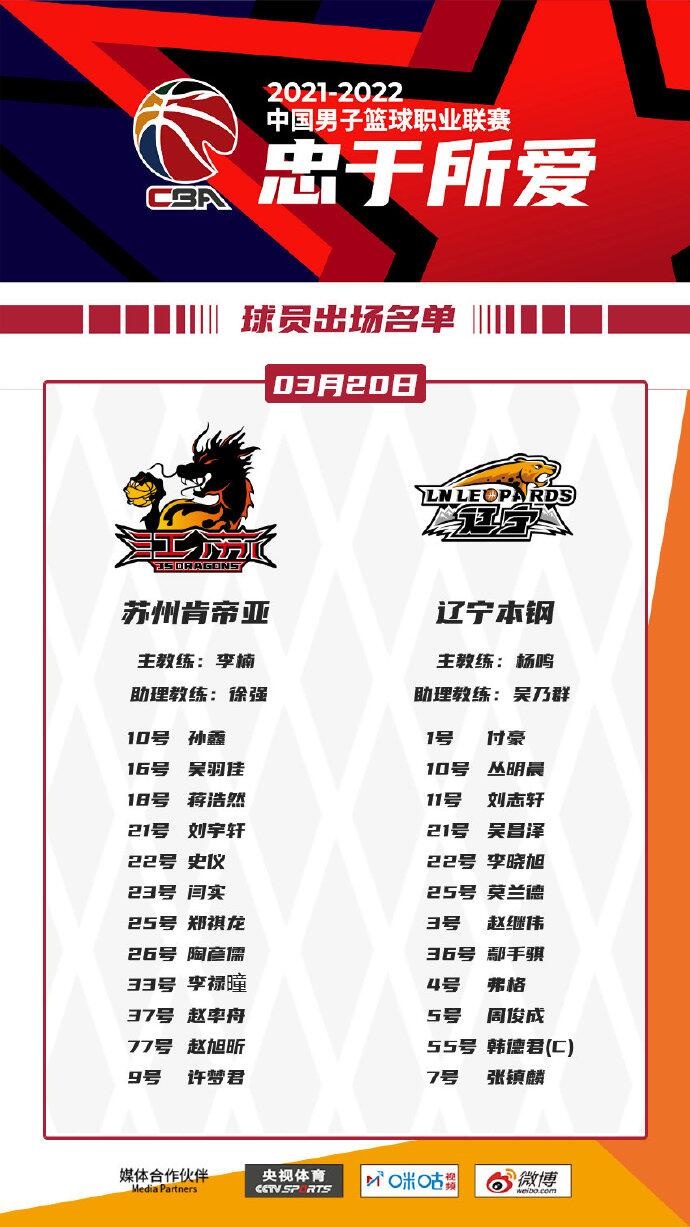 3月20日讯今天中午11:00,辽宁将对阵江苏。
