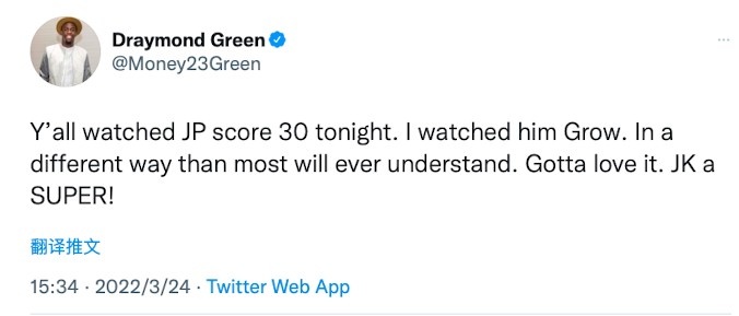 直播吧3月24日讯今天结束的一场NBA常规赛,勇士118-104力克热火。赛后,勇士前锋追梦格林发推点评了普尔和库明加本场表现,他写道:“你们都看到今晚普尔得30分了吧。我见证了他的成长,他的成长之路