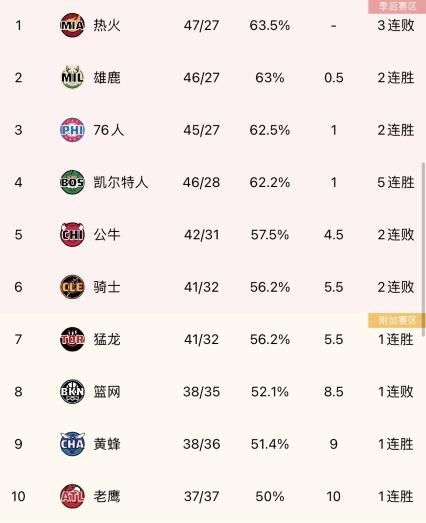 这样,东部前四只有一个胜场差,第一的热火与雄鹿仅有0.5,雄鹿与76人、绿军也只有0.5之差。