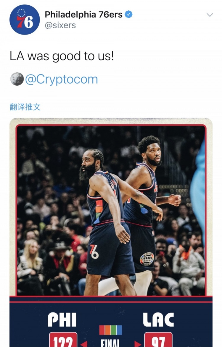 赛后,76人官方推特账号发文:“洛杉矶对我们很好。”
