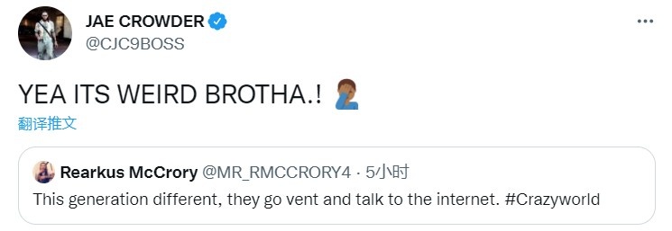 一位网友写道:这一代人不同,喜欢去网上发泄和交谈。随后克劳德转发此条推特并写道:是的,这太奇怪了兄歹!